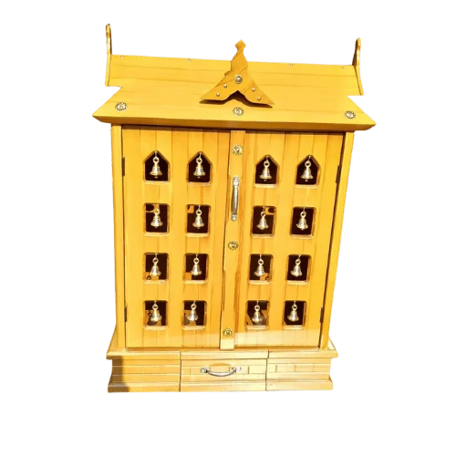 The 16 Bell Ambalam embodies traditional Kerala craftsmanship with its elegant and devotional design. Expertly crafted from premium MDF (Medium Density Fibre), it showcases authentic temple-style detailing inspired by the spiritual essence of Kerala’s heritage. Featuring a graceful 16 brass bell arrangement, this pooja mandir creates a serene and divine ambiance during worship. Compact yet elegant, it measures 25 × 10 × 35 inches and can also be wall-mounted to save space, making it perfect for apartments or smaller prayer areas. Available in Teak, Antic, and White finishes, it seamlessly complements both modern and traditional interiors. Ideal for use as a Mandir, Wooden Temple, or Pooja Mandapam, it combines affordability with timeless craftsmanship. Thrissur’s only 5-star rated furniture shop, offering custom orders and free delivery (T&C apply), ensures quality, devotion, and beauty in every handcrafted piece.