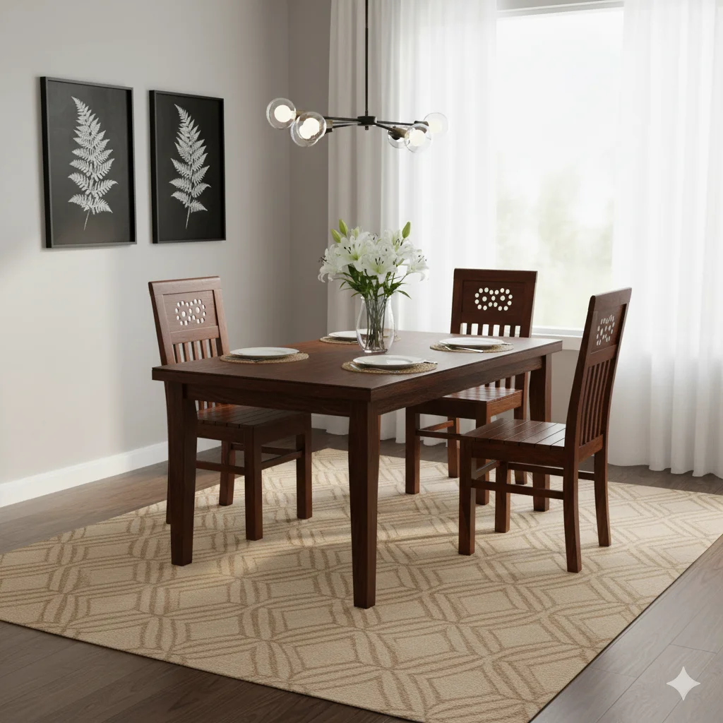The Achappam Acacia Palaka Dining Chair blends traditional Kerala artistry with modern durability, making it a unique and elegant addition to any dining space. Crafted from premium Nilambur heavy Acacia wood, renowned for its strength and longevity, it features a backrest inspired by the traditional Achappam (rosette) design, adding an artistic and cultural touch to your interiors. The solid Palaka wooden seat ensures firm, all-wood seating comfort, combining practicality with elegance. Available in Cushion or Full Wood variants and finished in Acacia, Teak, or Mahogany, this chair can be customized to perfectly fit your dining setup. Its smooth polished surface allows easy maintenance, making it ideal for daily use. With a combination of heritage-inspired design, robust construction, and comfort, the Achappam Acacia Palaka Dining Chair complements both traditional and contemporary interiors. Thrissur’s only 5-star rated furniture shop offers it with custom orders and free delivery (T&C apply), ensuring quality, style, and convenience in every purchase.