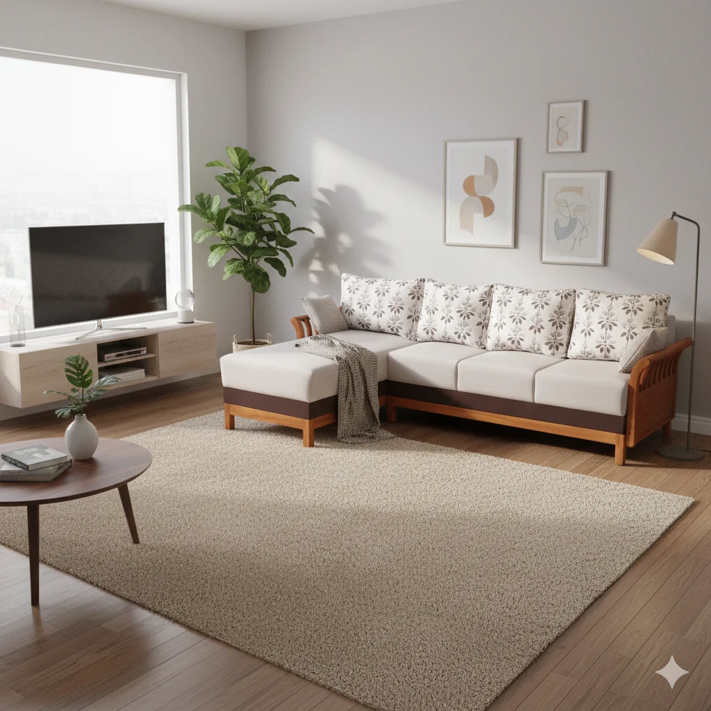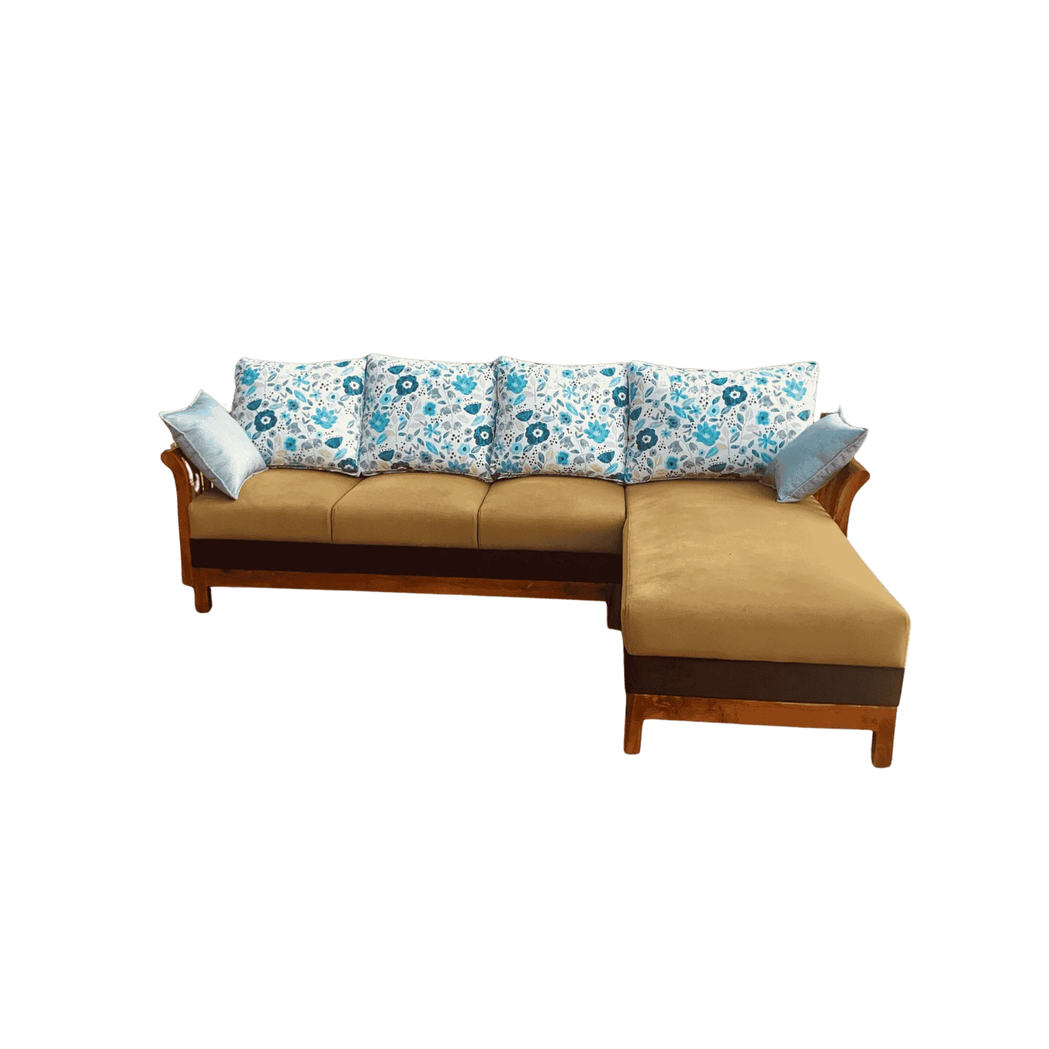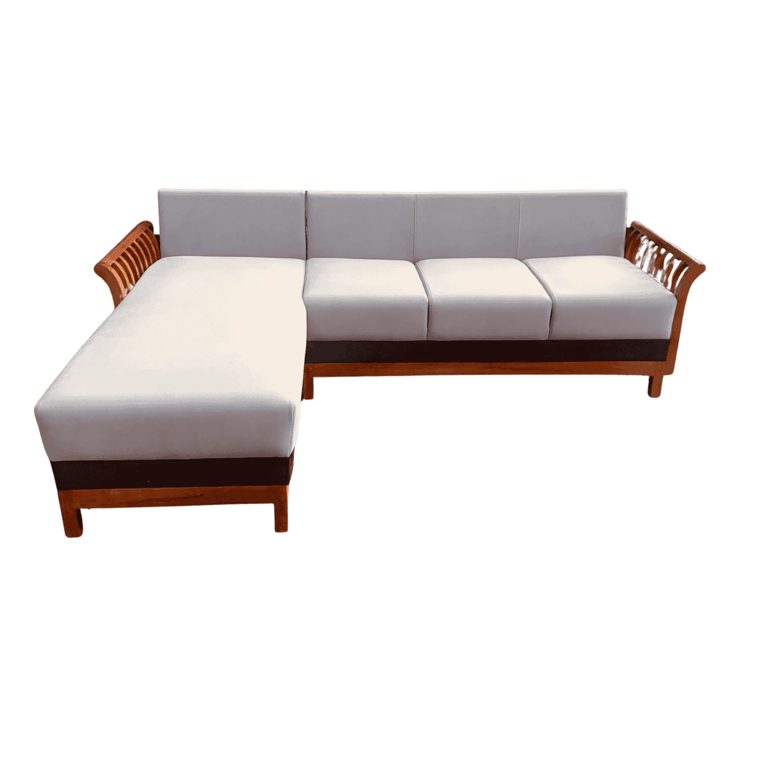 The AuraWave Full Cover Corner Sofa Set 3+Diwan is a thoughtfully designed L-shaped corner sofa set created for modern living rooms that value both luxury and functionality. Featuring a 3-seater sofa combined with a 6-feet full cover diwan, this sofa offers extra-wide lounging space ideal for stretching out, relaxing, or casual sleeping. Built with a strong internal structure and enhanced by solid teak wood handrests, it delivers excellent durability, stability, and a premium wooden accent. The sofa is upholstered in soft, breathable HR cloth fabric, paired with elegant floral print pillows that elevate visual appeal while providing enhanced back support. Designed for relaxed everyday comfort, the generously padded cushions ensure long hours of comfortable seating. Its space-efficient corner layout helps maximize seating while maintaining an open, stylish look in spacious living areas. Fully customizable in upholstery, cushion firmness, and finish, this sofa set reflects refined craftsmanship from Thrissur’s only 5-star rated furniture shop, offering custom orders, live color changes, and free & on-time delivery (T&C apply)—making the AuraWave a perfect blend of comfort, elegance, and long-lasting value.