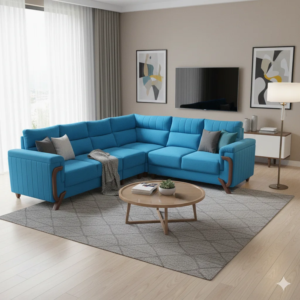 The Gua Full Cover Corner Sofa Set 2+2+1 with G-Shaped Handle and Duraflex Foam offers a perfect blend of comfort, style, and durability for any living room. Expertly crafted in-house with Redgum treated wood and Marine plywood, it is reinforced with a 3.5-inch 5-line belt to ensure long-lasting strength and stability. The Duraflex, Density 32 foam cushions provide plush, supportive seating that maintains its shape over time, while the Reliance Recron back support ensures ergonomic comfort for extended lounging. Its waterproof, washable fabric makes maintenance effortless, and the G-Shaped handle design adds a unique, stylish touch while remaining functional. Shown in a 2+2+1+Corner configuration, this sofa is available in multiple sizes and layouts — from 2-seaters to 7-seaters, 2+1, 3+1, 3+2+1, Diwan, L-Shape, Corner, Sectional, Loveseat, and more — to fit any home. With a sleek, full-cover design, it enhances your living space while offering versatile seating arrangements for family and guests. Thrissur’s only 5-star rated furniture shop guarantees quality, style, and convenience with every purchase, along with custom orders and free delivery (T&C apply).