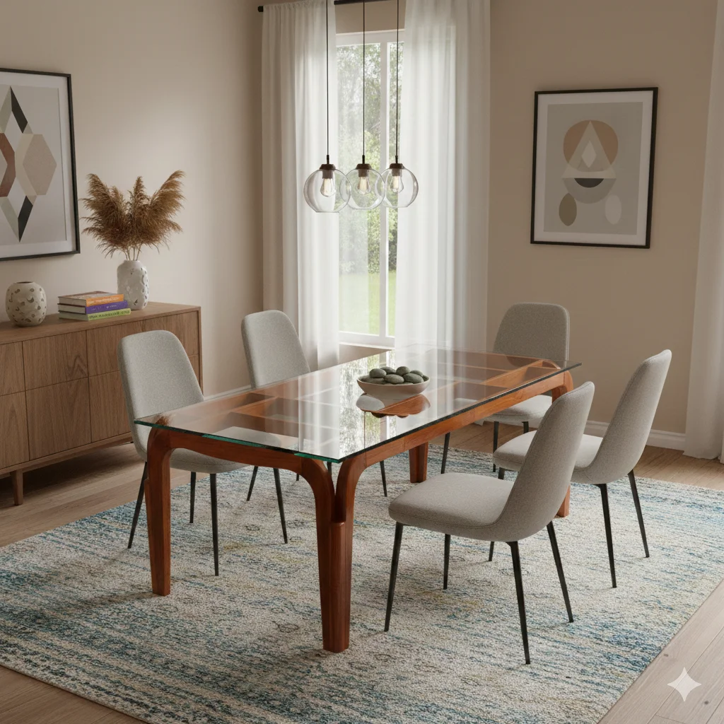 The Hocky Teak Dining Table 6×3.5 is crafted from premium-quality solid teak wood, designed to deliver exceptional strength, stability, and everyday elegance. Featuring a bold contemporary straight-frame construction with smooth rounded leg edges, this dining table offers excellent load-bearing support while maintaining a clean, modern aesthetic. Its spacious 8-seater design makes it ideal for family dining, gatherings, and daily use, while the plain top finish enhances its timeless appeal. Available with multiple top options including plain wood, glass, marble, and granite, the Hocky dining table blends seamlessly into both modern and classic interiors. Offered in standard and custom sizes, with customizable polish and top finishes, it ensures a perfect fit for your dining space. Presented by Thrissur’s only 5-star rated furniture shop, this dining table comes with expert craftsmanship, full customization options, and free & on-time delivery (T&C apply)—making it a perfect balance of durability, style, and functionality.