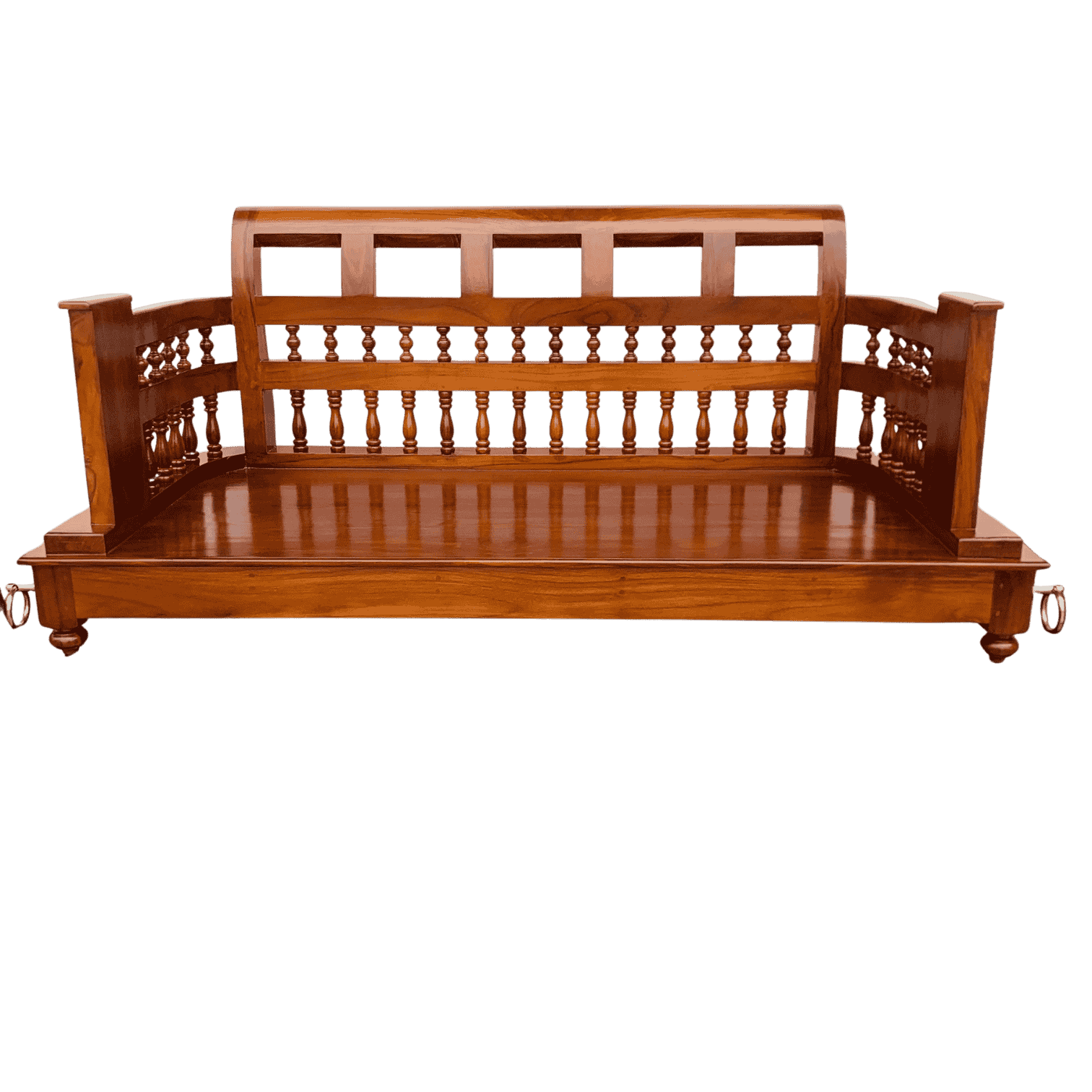The Luxury Teak Swing 4×2 is a beautifully crafted seating solution designed to bring elegance and comfort to any living space. Made from premium-grade teak wood, it ensures unmatched strength, durability, and a natural shine that lasts for years. The swing features an intricately designed backrest with handcrafted patterns, exuding a royal and traditional aesthetic, while the ergonomically curved handrests provide enhanced comfort and style. Measuring 5 × 2 ft and available in sizes 4×2, 5×2, and 6×2 ft, it can be customized to perfectly fit verandas, pooja spaces, living rooms, or patios. Equipped with 7 ft stainless steel hanging chains for secure installation, it also offers optional bronze or custom chain variants to match your preference. Available in Teak, Mahogany, Acacia, and Manchiyam, this swing combines classic Kerala luxury craftsmanship with modern versatility. As a product from Thrissur’s 5-star rated furniture shop, it can be fully customized in size, wood type, and chain options, with free delivery (T&C apply), delivering a regal, durable, and comfortable addition to your home.