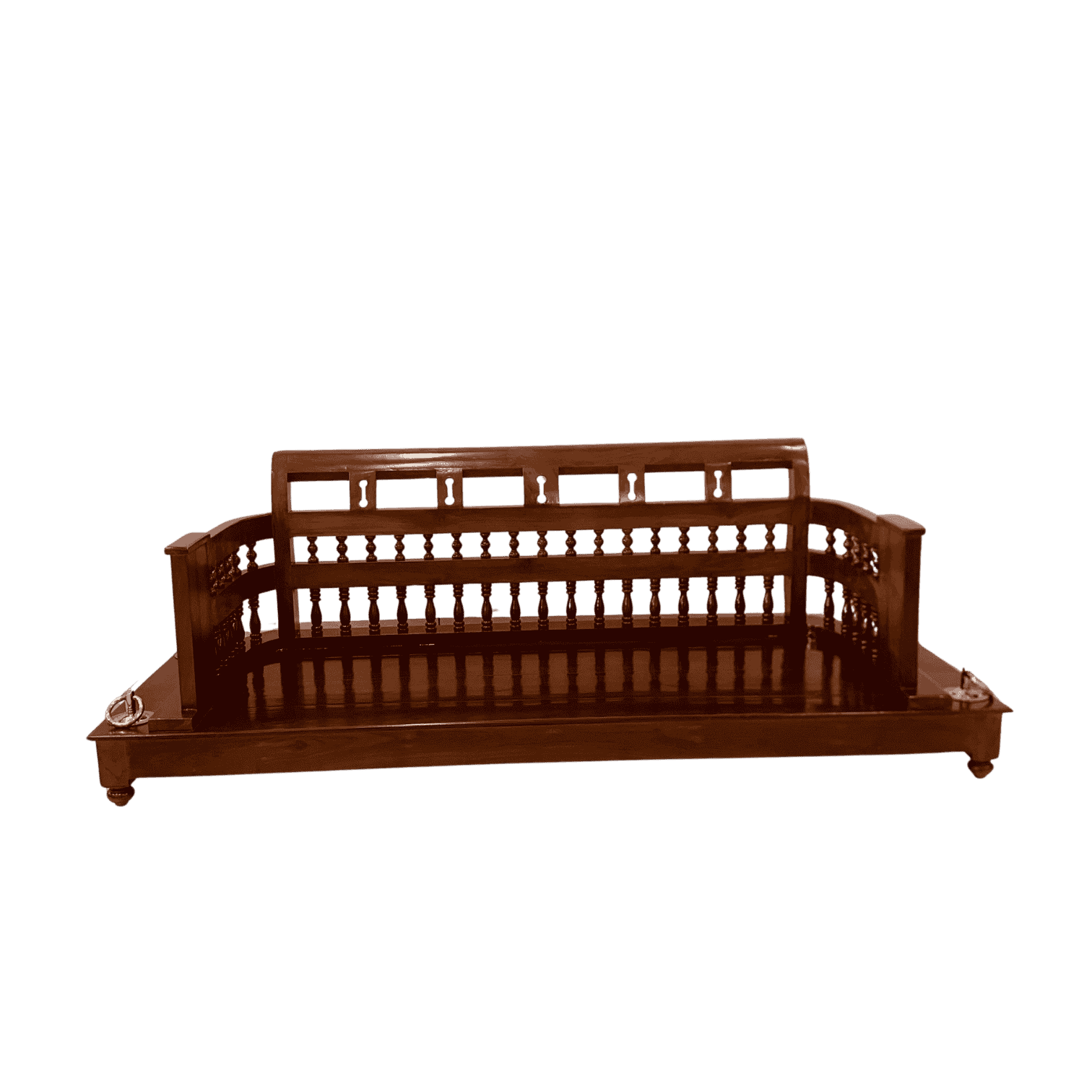 The Luxury Teak Swing 5X2 is a beautifully crafted seating solution designed to bring elegance and comfort to any living space. Made from premium-grade teak wood, it ensures unmatched strength, durability, and a natural shine that lasts for years. The swing features an intricately designed backrest with handcrafted patterns, exuding a royal and traditional aesthetic, while the ergonomically curved handrests provide enhanced comfort and style. Measuring 5 × 2 ft and available in sizes 4×2, 5×2, and 6×2 ft, it can be customized to perfectly fit verandas, pooja spaces, living rooms, or patios. Equipped with 7 ft stainless steel hanging chains for secure installation, it also offers optional bronze or custom chain variants to match your preference. Available in Teak, Mahogany, Acacia, and Manchiyam, this swing combines classic Kerala luxury craftsmanship with modern versatility. As a product from Thrissur’s 5-star rated furniture shop, it can be fully customized in size, wood type, and chain options, with free delivery (T&C apply), delivering a regal, durable, and comfortable addition to your home.