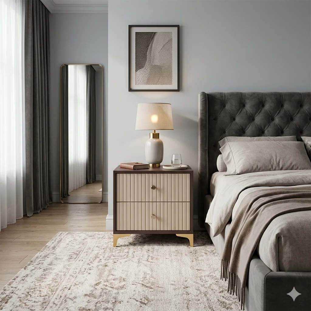 ✨ Design: Compact bedside table with panel detailing & golden accents