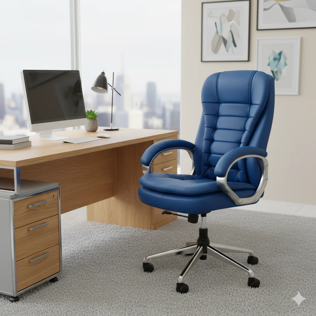 The Premium High Back Office Chair is designed for ultimate comfort, luxury, and long hours of work in professional settings. Featuring a tall backrest with contoured high-density foam padding, it provides excellent back, neck, and lumbar support for optimal posture. The chair includes adjustable seat height, tilt tension control, and full 360° swivel functionality, allowing personalized ergonomic comfort. Built with a chrome-plated metal base and smooth-rolling caster wheels, it ensures durability, stability, and effortless mobility across all surfaces. Upholstered in premium leatherette, the chair combines plush comfort with a sophisticated, executive appearance, making it ideal for corporate offices, executive cabins, and home workspaces. Perfect for managers, professionals, and executives seeking both style and functionality, it is backed by Thrissur’s only 5-star rated furniture shop, offering custom order options and free delivery (T&C apply) for a premium, worry-free seating solution.