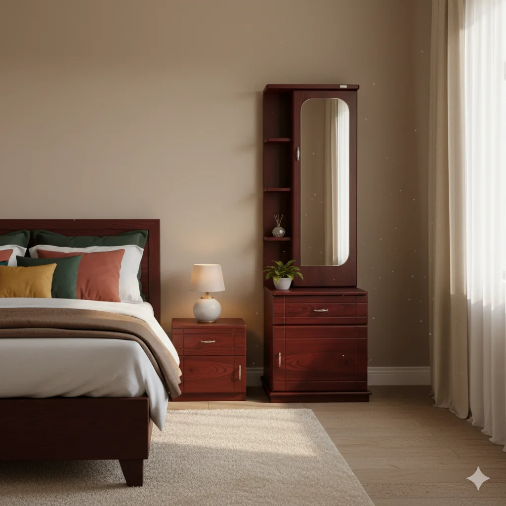 The Premium MDF Dressing Table is a floor-standing unit crafted from high-quality MDF for durability and a smooth finish. It features a mirror and multiple storage compartments, providing organized space for cosmetics, accessories, and daily essentials. Its sleek, modern design complements any bedroom interior while offering ample functional storage. Available in Particle Board, MDF, Teak, and Manchiyam, and in Black, Antic, and Teak, it fits a variety of décor styles. As Thrissur’s only 5-star rated furniture shop, we provide custom orders and free delivery (T&C apply), ensuring quality, style, and convenience with every purchase.
