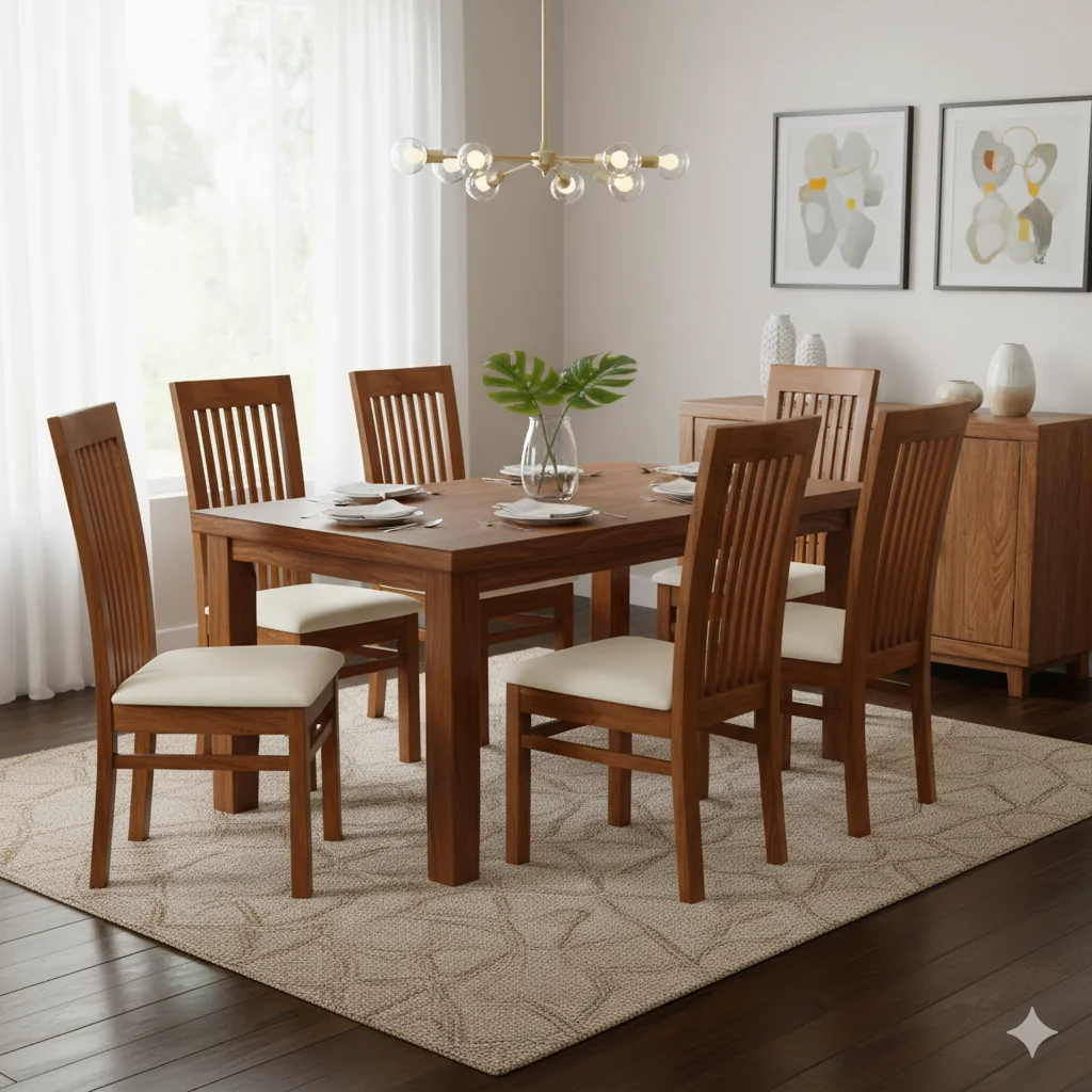 The Reeper Frame Teak Cushion Dining Chair is a perfect blend of traditional elegance and modern comfort, crafted from premium quality teak wood for long-lasting durability and natural beauty. Its vertical reeper-style backrest provides ergonomic support while adding a stylish slatted pattern, enhancing the overall visual appeal of your dining space. The soft cushioned seat ensures maximum comfort during meals, making it ideal for both everyday use and special gatherings. Expertly handcrafted, this chair combines strength, stability, and refined design, seamlessly complementing classic or contemporary dining interiors. Customization options for fabric, color, and size allow you to tailor the chair to your exact needs. Thrissur’s only 5⭐ rated furniture shop offers this premium dining chair with custom orders and free delivery (T&C apply), ensuring quality, style, and convenience with every purchase.