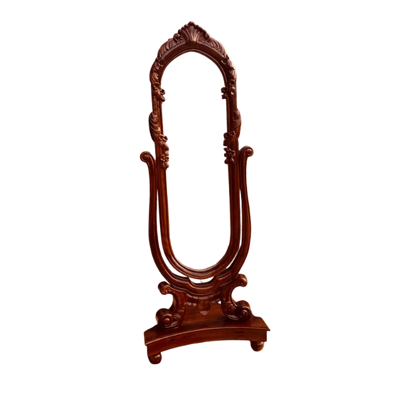 The Singapore Full Length Teak Dressing Mirror is a timeless and elegant addition to any bedroom or dressing space, designed to blend classic craftsmanship with everyday functionality. Made from premium teak wood, this floor-standing full-length mirror features a beautifully carved traditional frame that adds a touch of royal charm and sophistication to your interiors. The adjustable mirror angle allows you to set the perfect viewing position for comfortable daily grooming and outfit checks, while the sturdy base ensures excellent stability and safety for regular use. With its ornate detailing, smooth polished finish, and durable teak construction, this mirror enhances both aesthetics and practicality. From Thrissur’s only 5-star rated furniture shop, it comes with live color change options, customization, and free & on-time delivery (T&C apply)—making it an ideal choice for those seeking a premium full-length teak dressing mirror with classic design and long-lasting quality.