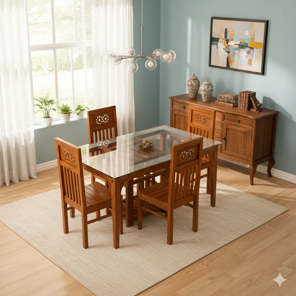 The Tube Teak Dinning Table 5×3 is crafted from premium solid teak wood and built with signature thick tubular legs that add a modern touch while ensuring exceptional strength. Its 5×3 ft size seats four comfortably, making it ideal for compact and medium dining spaces. You can choose from multiple top options such as plain glass, cooling glass, etched glass, or marble—each smooth, stylish, and easy to clean. It is available in all standard and custom sizes, including 6×3.5, 6×3, 5×3, and 4×3. The table delivers long-lasting durability, a natural teak finish, and reliable daily performance. As Thrissur’s only 5⭐ Google-rated furniture shop, Nakshatra Furniture ensures trusted craftsmanship, custom orders, and free delivery (T&C apply). Upgrade prices are clear: Etching Glass +₹650, Cooling Glass +₹650, Marble Plain +₹4,000, Double Marble +₹5,500, Double Tapering +₹6,500, 45 mm Marble +₹6,500, and G7 Granite +₹13,000.
