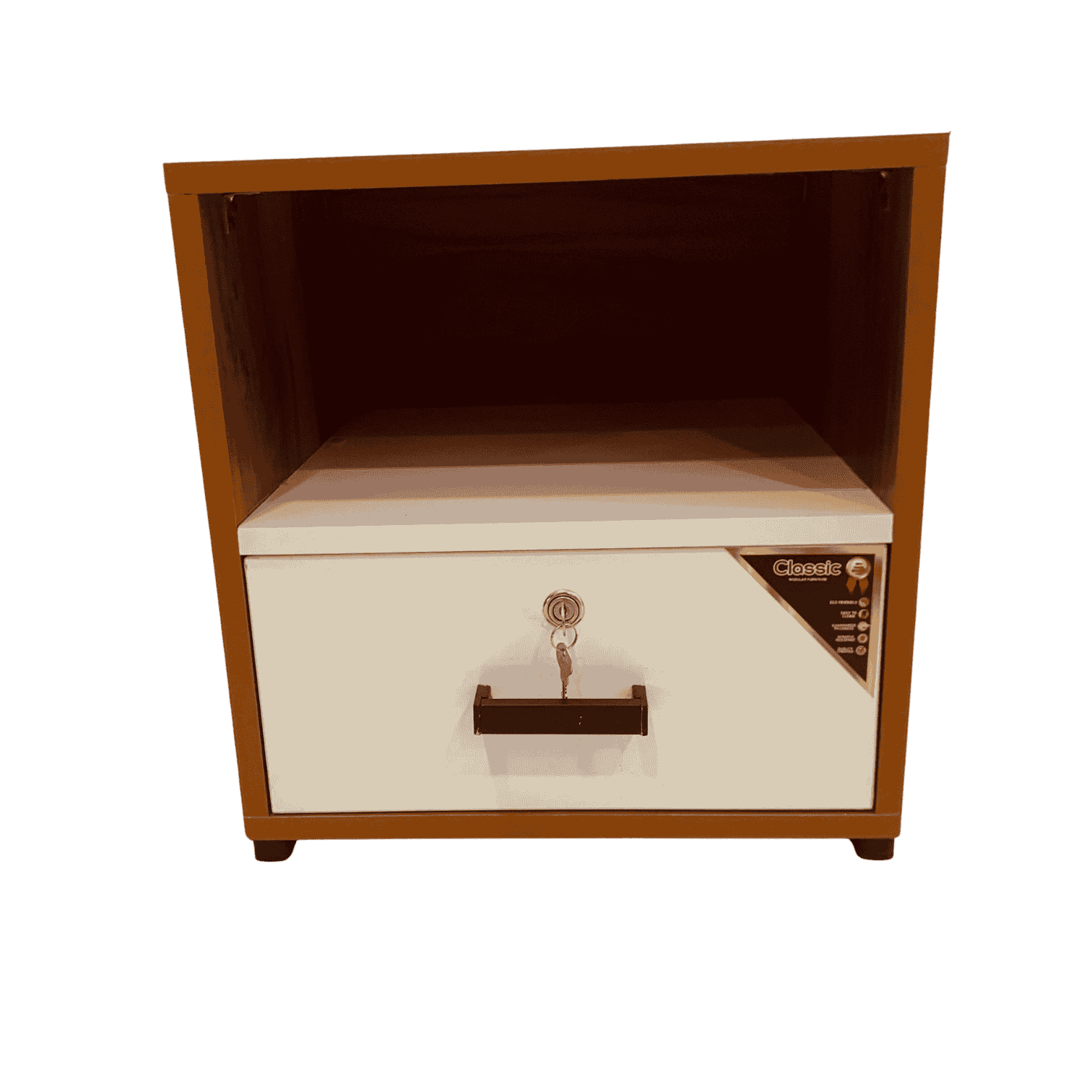 The Unibox UV Board Side Table 16×16×24 is a stylish and functional bedside companion designed to offer convenience, durability, and modern appeal. Crafted from premium full UV board, it features a smooth, long-lasting finish that enhances both strength and elegance. Its smart layout includes one lockable drawer for secure storage and one open shelf for quick access to daily essentials, making it perfect for keeping phones, remotes, books, or medications within reach. Available in a White and Teakwood dual-tone finish, this side table complements both contemporary and classic interiors effortlessly. Sized at 16 × 16 × 24 inches, it fits comfortably beside any cot or bed, with custom size options available to match your space. Backed by Thrissur’s only 5-star rated furniture shop, you also enjoy custom-made orders and free delivery (T&C apply), ensuring quality, convenience, and style in one premium piece.