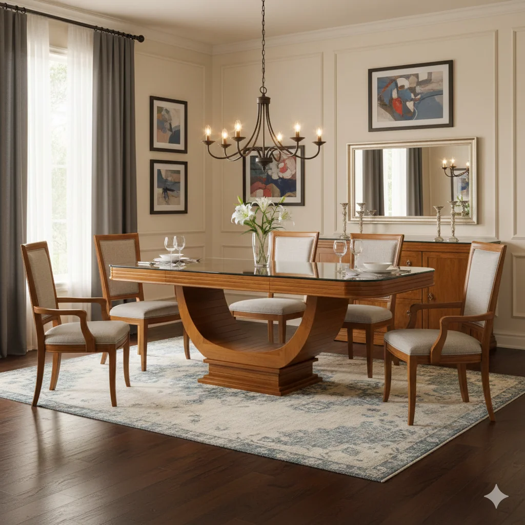 The Vanji Teak Dining Table 6×3.5 is a beautifully crafted premium boat-shaped teak dining table designed to bring elegance, strength, and everyday functionality to your dining space. Made from solid teak wood, it comes in a spacious 6×3.5 ft 8-seater size, offering excellent legroom and a wide tabletop ideal for family meals and gatherings. The table features Nakshatra’s signature thick-leg craftsmanship, ensuring superior durability, stability, and long-lasting performance. It includes a 12 mm plain glass top, with upgrade options such as cooling glass, etched glass, and marble to match your interior style. The smooth boat-shaped design adds a modern aesthetic while providing enhanced seating comfort. Available in multiple sizes including 6×3.5, 6×3, 5×3, 4×3 ft, and fully customizable to any dimension, this dining table fits perfectly into homes of all sizes. With its strong build, premium teak finish, and elegant contours, it becomes a stylish and dependable centerpiece for your dining room. As Thrissur’s only 5-star rated furniture shop offering custom orders and free delivery (T&C apply), we guarantee premium quality, trusted service, and a superior dining experience.
